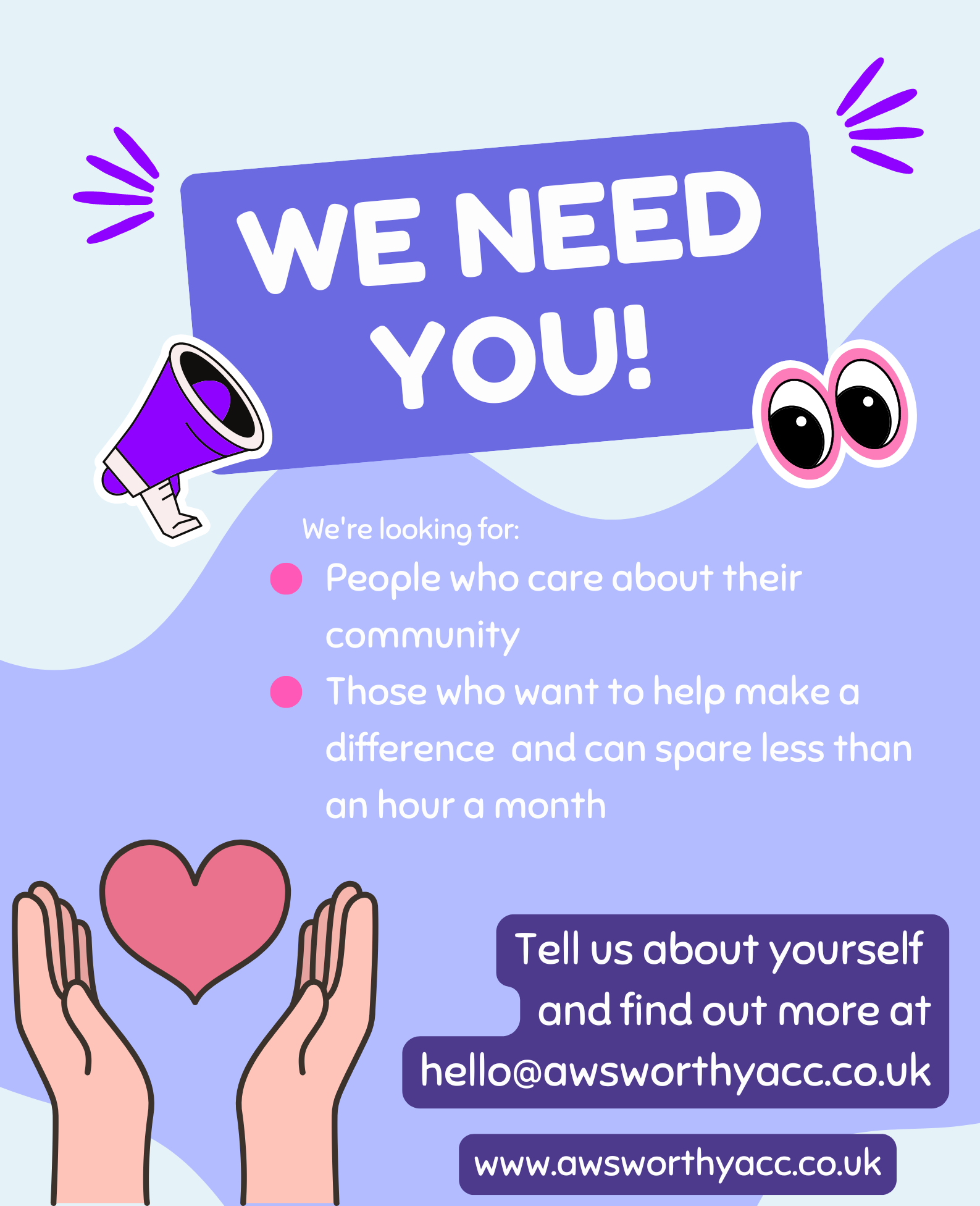 If you think that could make a difference and would like to know more, please contact us at hello@awsworthyacc.co.uk and tell us more about yourself and what you have to offer our charity.